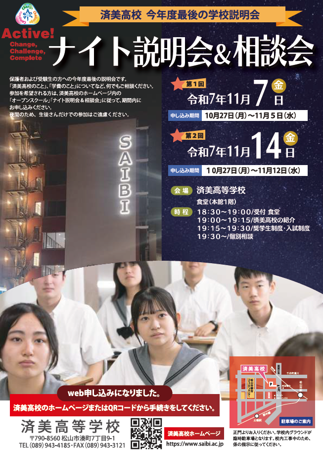TOP > 学校からのお知らせ > 見学会・体験会関連 > R7年🌙ナイト説明会&相談会✨ お知らせ見学会・体験会関連 2025.10.27 R7年🌙ナイト説明会&相談会✨ オープンスクール 第1回 ナイト説明会&相談会 ■開催日11月7日(金)■申込受付期間:10月27日(月)~11月5日(水) 第2回 ナイト説明会&相談会 ■開催日11月14日(金)■申込受付期間:11月27日(月)~11月12日(水) ■お申込み 初めての方は、下記「中学生の方へ」ボタンをクリックし申込手続きをお願いします。既に登録されている方は、ログインして申込可能です。 中学生の方はこちら 生徒用・操作手順(pdfで見る) 先生方はこちら 先生用・操作手順(pdfで見る) 保護者の方はこちら 保護者用・操作手順(pdfで見る) お知らせ一覧 新着記事 見学会・体験会関連 2025.10.27 R7年🌙ナイト説明会&相談会✨ オープンスクール 学校からのお知らせ 2025.10.21 🏫 令和7年度「済美高校 文化祭」開催のお知らせ 学校行事 入試・入学関連 2025.10.06 Web出願マニュアル(受験生用)、調査書用用紙申し込みのご案内【締切:11月14日(金)】 校長室から 2025.10.02 【校長便り10月】駅留(えきどめ) 学校行事 FIND!キーワードやタグで検索! 写真部の作品 弓道部 模擬国連 野球部 PTA 校外スポーツ活動 食物科学コース 美術科 合唱部 オープンスクール 大会実績 コンテスト キャリア教育講座 学校行事 卒業生の活躍 アート&デザイン作品