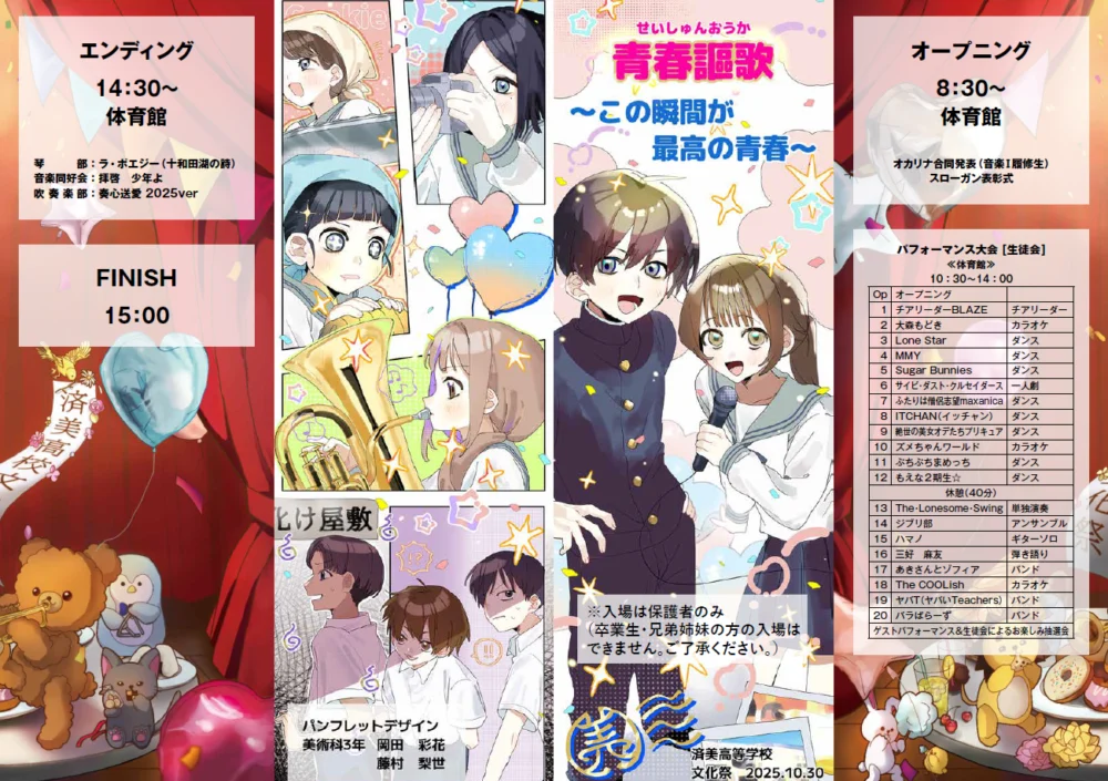 TOP > 学校からのお知らせ > 学校からのお知らせ > 🏫 令和7年度「済美高校 文化祭」開催のお知らせ お知らせ学校からのお知らせ 2025.10.21 🏫 令和7年度「済美高校 文化祭」開催のお知らせ 学校行事 本校では、令和7年10月30日(木)8:30より文化祭を開催いたします。生徒たちの日頃の学びや活動の成果を披露する、年に一度の大切な行事です。当日は、一般公開を保護者の方のみとさせていただきます。誠に恐縮ですが、卒業生や兄弟姉妹の方のご入場はご遠慮ください。皆さまのご理解とご協力をお願いいたします。当日のプログラムや注意事項については、以下のPDFよりご確認ください。📄 [文化祭パンフレット表(PDF)]📄 [文化祭パンフレット裏(PDF)]📄 [文化祭ご案内・注意事項(PDF)] お知らせ一覧 新着記事 学校からのお知らせ 2025.10.21 🏫 令和7年度「済美高校 文化祭」開催のお知らせ 学校行事 入試・入学関連 2025.10.06 Web出願マニュアル(受験生用)、調査書用用紙申し込みのご案内【締切:11月14日(金)】 校長室から 2025.10.02 【校長便り10月】駅留(えきどめ) 学校行事 学校からのお知らせ 2025.10.01 Stylish New Style✨冬の制服が新しくなります(令和8年度入学生対象) FIND!キーワードやタグで検索! 写真部の作品 弓道部 模擬国連 野球部 PTA 校外スポーツ活動 食物科学コース 美術科 合唱部 オープンスクール 大会実績 コンテスト キャリア教育講座 学校行事 卒業生の活躍 アート&デザイン作品