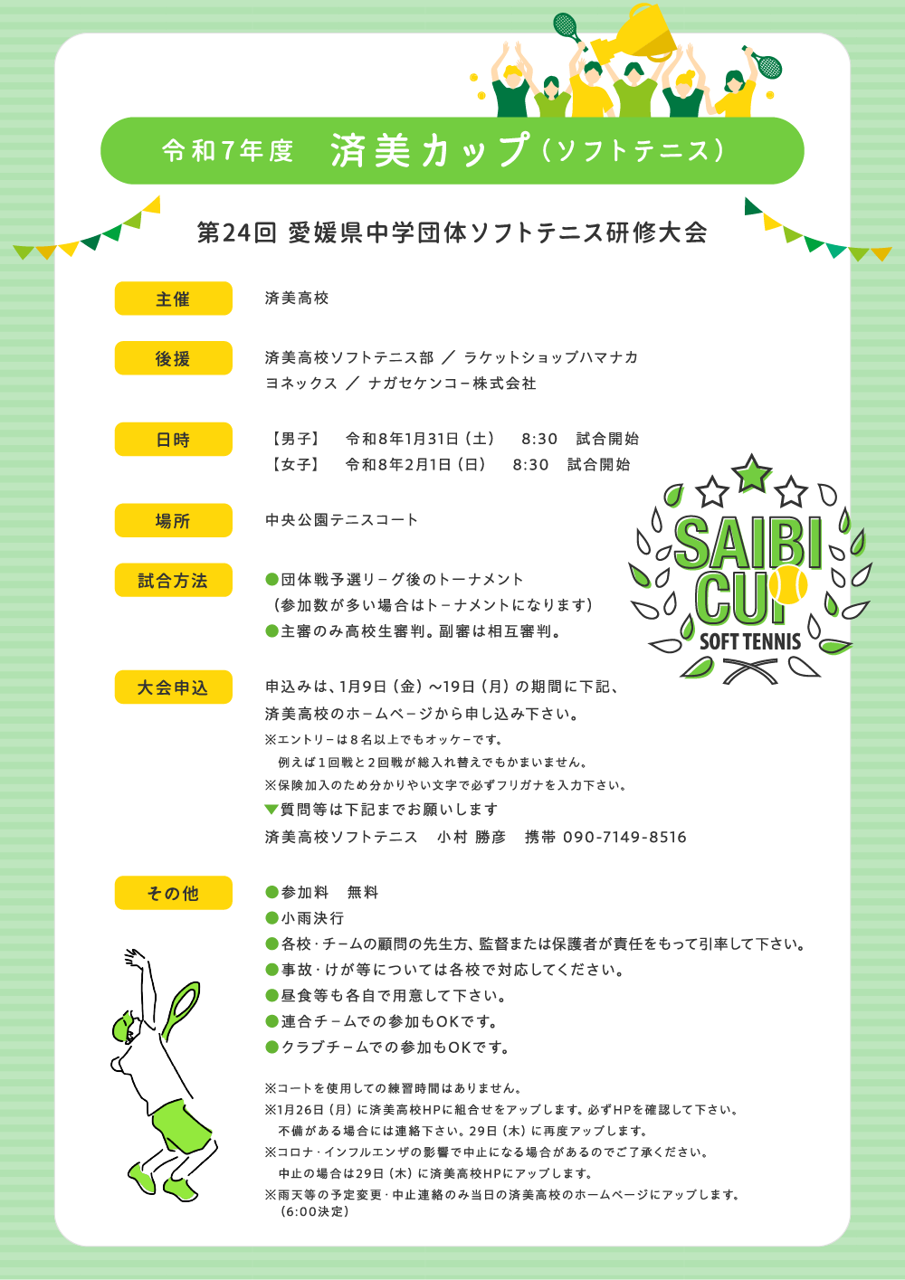 TOP > 学校からのお知らせ > 学校からのお知らせ > 令和7年度 済美カップ(ソフトテニス)開催のお知らせ お知らせ学校からのお知らせ 2025.12.04 令和7年度 済美カップ(ソフトテニス)開催のお知らせ 学校行事 第24回 愛媛県中学団体ソフトテニス研修大会を開催いたします。申込はホームページからとなります。申込期間:2026年1月9日(金)から1月19日(月) お申込はこちらから お申込フォーム 事前のご確認 要事項を全て入力後、「申し込み」を押すと、「ありがとうございます。メッセージは送信されました。」と表示され、確認のメールが届きます。確認のメールが届いた時点で申し込みが完了となりますので、確認のメールが届くように設定をお願いします。ご質問や不明な点がある場合は、下記までお願いします。済美高校ソフトテニス部 顧問 小村 勝彦携帯:090-7149-8516 または メール: k-komura@saibi.net お問い合わせの前にご確認くださいドメイン指定受信等を設定している場合は「saibi-softtennis@saibi.ac.jp 」からのメールが受信できる状態に設定してください。お問い合わせ後に申込内容のメールが届かない場合、ご使用のメールソフトやセキュリティソフト等により迷惑メールとして処理されている可能性がございます。迷惑フォルダ内の確認をお願いいたします。 性別 男子女子 中学校名(チーム名) 監督名 【1組目】 (NO.1)選手名 フリガナ 生年月日 学年 選択してください12 (NO.2)選手名 フリガナ 生年月日 学年 選択してください12 【2組目】 (NO.3)選手名 フリガナ 生年月日 学年 選択してください12 (NO.4)選手名 フリガナ 生年月日 学年 選択してください12 【3組目】 (NO.5)選手名 フリガナ 生年月日 学年 選択してください12 (NO.6)選手名 フリガナ 生年月日 学年 選択してください12 【4組目】 (NO.7)選手名 フリガナ 生年月日 学年 選択してください12 (NO.8)選手名 フリガナ 生年月日 学年 選択してください12 【5組目】 (NO.9)選手名 フリガナ 生年月日 学年 選択してください12 (NO.10)選手名 フリガナ 生年月日 学年 選択してください12 【6組目】 (NO.11)選手名 フリガナ 生年月日 学年 選択してください12 (NO.12)選手名 フリガナ 生年月日 学年 選択してください12 【7組目】 (NO.13)選手名 フリガナ 生年月日 学年 選択してください12 (NO.14)選手名 フリガナ 生年月日 学年 選択してください12 【8組目】 (NO.15)選手名 フリガナ 生年月日 学年 選択してください12 (NO.16)選手名 フリガナ 生年月日 学年 選択してください12 申込責任者(中学校(チーム名)) 申込責任者(氏名) 申込責任者の電話番号 例:089-123-4567 申込責任者の携帯番号 例:090-1234-5678 申込責任者(送信された方)のメールアドレスを入力してください ※緊急連絡用です。入力ミスのないように入力してください。なお、@saibi.ac.jp からのメールが届くよう、設定をお願いします。 Δ ↓↓↓ こちらは、組み合わせが決まったら掲載します。 組み合わせ表 組み合わせ表は、pdfで公開しています。下記よりクリックしてご利用ください。⇒男子トーナメント表⇒女子トーナメント表⇒男子予選リーグ表(NO1)⇒男子予選リーグ表(NO2)⇒女子予選リーグ表 (NO1)⇒女子予選リーグ表 (NO2)⇒男子進行表⇒女子進行表【お願い】女子の監督の先生方は試合進行に協力していただきたいので、必ず進行表を確認してください。よろしくお願いします。 お知らせ一覧 新着記事 学校からのお知らせ 2025.12.04 令和7年度 済美カップ(ソフトテニス)開催のお知らせ 学校行事 校長室から 2025.12.04 【校長便り12月】ユーミン 学校行事 生徒会便り 2025.11.14 生徒会だより | 11月号~文化祭~ 学校行事 学校からのお知らせ 2025.11.14 済美展2025のお知らせ 美術科学校行事 FIND!キーワードやタグで検索! 合唱部 テニス部 弓道部 模擬国連 野球部 PTA 校外スポーツ活動 食物科学コース 美術科 写真部の作品 オープンスクール 大会実績 コンテスト キャリア教育講座 学校行事 卒業生の活躍 アート&デザイン作品