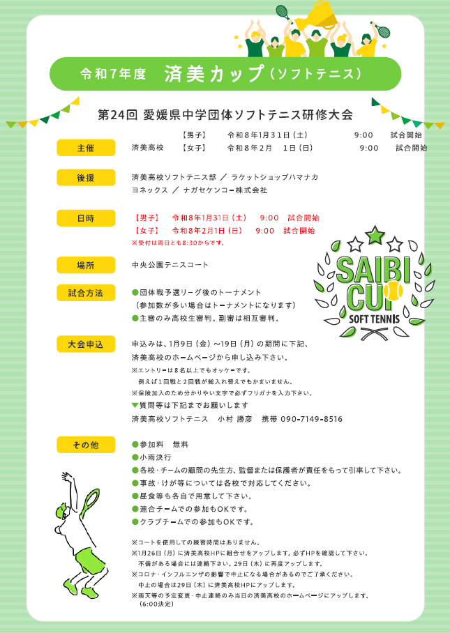 TOP > 学校からのお知らせ > 学校からのお知らせ > 令和7年度 済美カップ(ソフトテニス)開催のお知らせ お知らせ学校からのお知らせ 2025.12.04 令和7年度 済美カップ(ソフトテニス)開催のお知らせ 学校行事 令和7年度 済美カップ(ソフトテニス)開催のお知らせ第24回 愛媛県中学団体ソフトテニス研修大会を開催いたします。組み合わせ表は、pdfで公開しています。下記よりクリックしてご利用ください。【組み合わせ】📋男子組み合わせ📋男子進行表📋女子組み合わせ📋女子進行表【お願い】監督の先生方は試合進行に協力していただきたいので、必ず進行表を確認してください。よろしくお願いします。 第24回 愛媛県中学団体ソフトテニス研修大会を開催いたします。申込はホームページからとなります。申込期間:2026年1月9日(金)から1月19日(月) お申込はこちらから お申込フォーム 事前のご確認 要事項を全て入力後、「申し込み」を押すと、「ありがとうございます。メッセージは送信されました。」と表示され、確認のメールが届きます。確認のメールが届いた時点で申し込みが完了となりますので、確認のメールが届くように設定をお願いします。ご質問や不明な点がある場合は、下記までお願いします。済美高校ソフトテニス部 顧問 小村 勝彦携帯:090-7149-8516 または メール: k-komura@saibi.net お問い合わせの前にご確認くださいドメイン指定受信等を設定している場合は「saibi-softtennis@saibi.ac.jp 」からのメールが受信できる状態に設定してください。お問い合わせ後に申込内容のメールが届かない場合、ご使用のメールソフトやセキュリティソフト等により迷惑メールとして処理されている可能性がございます。迷惑フォルダ内の確認をお願いいたします。 性別 男子女子 中学校名(チーム名) 監督名 【1組目】 (NO.1)選手名 フリガナ 生年月日 学年 選択してください12 (NO.2)選手名 フリガナ 生年月日 学年 選択してください12 【2組目】 (NO.3)選手名 フリガナ 生年月日 学年 選択してください12 (NO.4)選手名 フリガナ 生年月日 学年 選択してください12 【3組目】 (NO.5)選手名 フリガナ 生年月日 学年 選択してください12 (NO.6)選手名 フリガナ 生年月日 学年 選択してください12 【4組目】 (NO.7)選手名 フリガナ 生年月日 学年 選択してください12 (NO.8)選手名 フリガナ 生年月日 学年 選択してください12 【5組目】 (NO.9)選手名 フリガナ 生年月日 学年 選択してください12 (NO.10)選手名 フリガナ 生年月日 学年 選択してください12 【6組目】 (NO.11)選手名 フリガナ 生年月日 学年 選択してください12 (NO.12)選手名 フリガナ 生年月日 学年 選択してください12 【7組目】 (NO.13)選手名 フリガナ 生年月日 学年 選択してください12 (NO.14)選手名 フリガナ 生年月日 学年 選択してください12 【8組目】 (NO.15)選手名 フリガナ 生年月日 学年 選択してください12 (NO.16)選手名 フリガナ 生年月日 学年 選択してください12 申込責任者(中学校(チーム名)) 申込責任者(氏名) 申込責任者の電話番号 例:089-123-4567 申込責任者の携帯番号 例:090-1234-5678 申込責任者(送信された方)のメールアドレスを入力してください ※緊急連絡用です。入力ミスのないように入力してください。なお、@saibi.ac.jp からのメールが届くよう、設定をお願いします。 Δ ↓↓↓ こちらは、組み合わせが決まったら掲載します。 組み合わせ表 組み合わせ表は、pdfで公開しています。下記よりクリックしてご利用ください。⇒男子トーナメント表⇒女子トーナメント表⇒男子予選リーグ表(NO1)⇒男子予選リーグ表(NO2)⇒女子予選リーグ表 (NO1)⇒女子予選リーグ表 (NO2)⇒男子進行表⇒女子進行表【お願い】女子の監督の先生方は試合進行に協力していただきたいので、必ず進行表を確認してください。よろしくお願いします。 お知らせ一覧 新着記事 校長室から 2026.01.09 【校長便り1月】令和8年 午年 学校行事 生徒会便り 2025.12.18 生徒会だより | コムズ 第3回ユースカフェに参加しました✨ 学校行事 学校からのお知らせ 2025.12.04 令和7年度 済美カップ(ソフトテニス)開催のお知らせ 学校行事 校長室から 2025.12.04 【校長便り12月】ユーミン 学校行事 FIND!キーワードやタグで検索! 合唱部 剣道部 テニス部 弓道部 模擬国連 野球部 PTA 校外スポーツ活動 食物科学コース 美術科 写真部の作品 オープンスクール 大会実績 コンテスト キャリア教育講座 学校行事 卒業生の活躍 学習合宿 アート&デザイン作品
