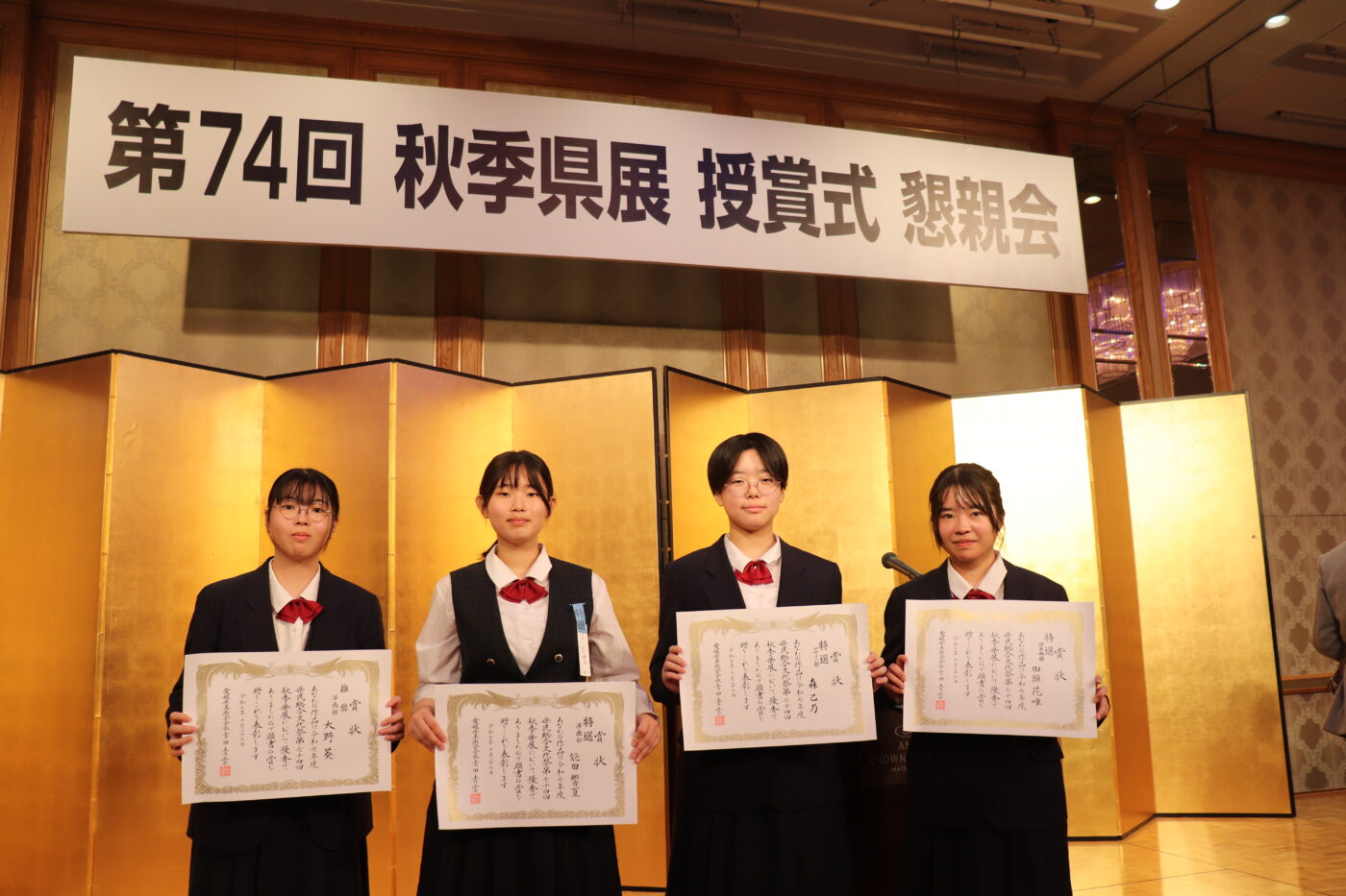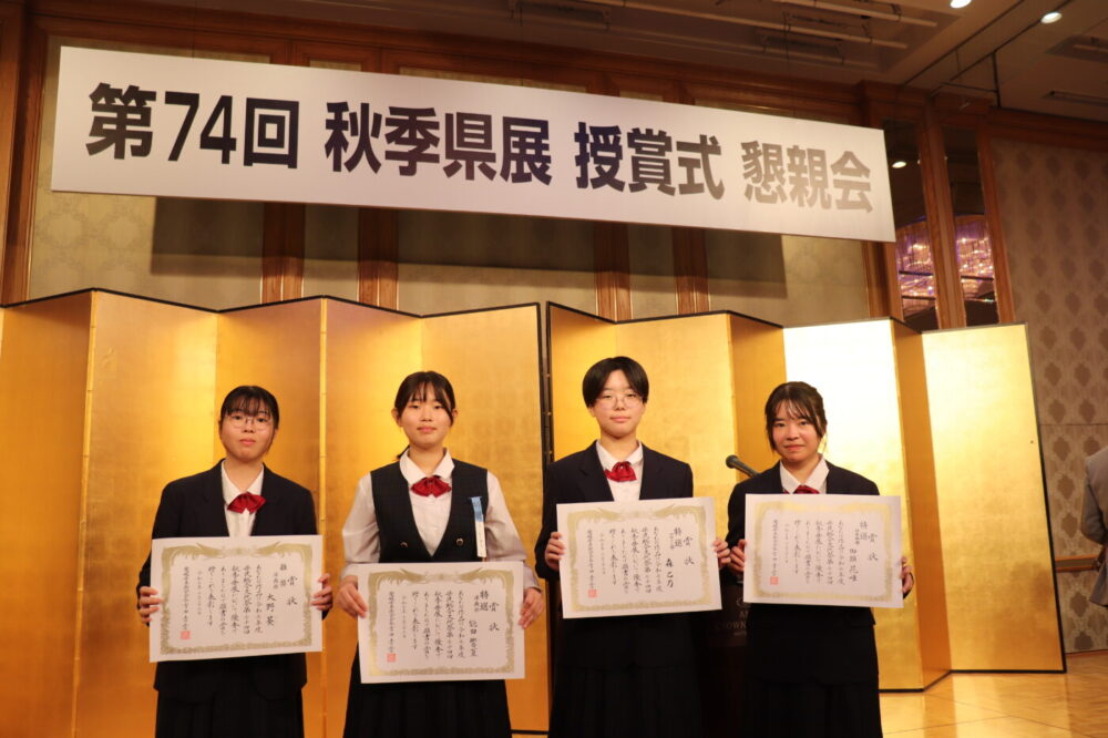 TOP > 今日の済美 > コンテスト > 第74回秋季愛媛県展 審査結果報告10月26日【美術科】 お知らせ今日の済美 2025.11.10 第74回秋季愛媛県展 審査結果報告10月26日【美術科】 コンテスト 今年度の秋季愛媛県展では、美術科より48名(3年25名、2年20名、1年3名)が入賞・入選いたしました。 また、10月26日(日) ANAクラウンプラザホテル松山にて受賞式が行われました。 「始動」 日本画部門【特選】 3年 田頭 花唯 「明日へ駆ける」 洋画部門【特選】 3年 能田 響夏 「Future Tangle」 デザイン部門【特選】 1年 森 乙乃 「忘れない心」 洋画部門【推奨】 3年 大野 葵 今日の済美一覧 新着記事 2025.11.10 第74回秋季愛媛県展 審査結果報告10月26日【美術科】 コンテスト 2025.10.31 携帯トイレ使用方法ポスターコンクール表彰式🚻✨ コンテスト 2025.10.27 【自然科学部】【第14回つまようじタワー耐震コンテスト4位】 コンテスト 2025.10.22 【海外研修】2年特進国際コ-ス 学校行事 FIND!キーワードやタグで検索! 写真部の作品 弓道部 模擬国連 野球部 PTA 校外スポーツ活動 食物科学コース 美術科 合唱部 オープンスクール 大会実績 コンテスト キャリア教育講座 学校行事 卒業生の活躍 アート&デザイン作品