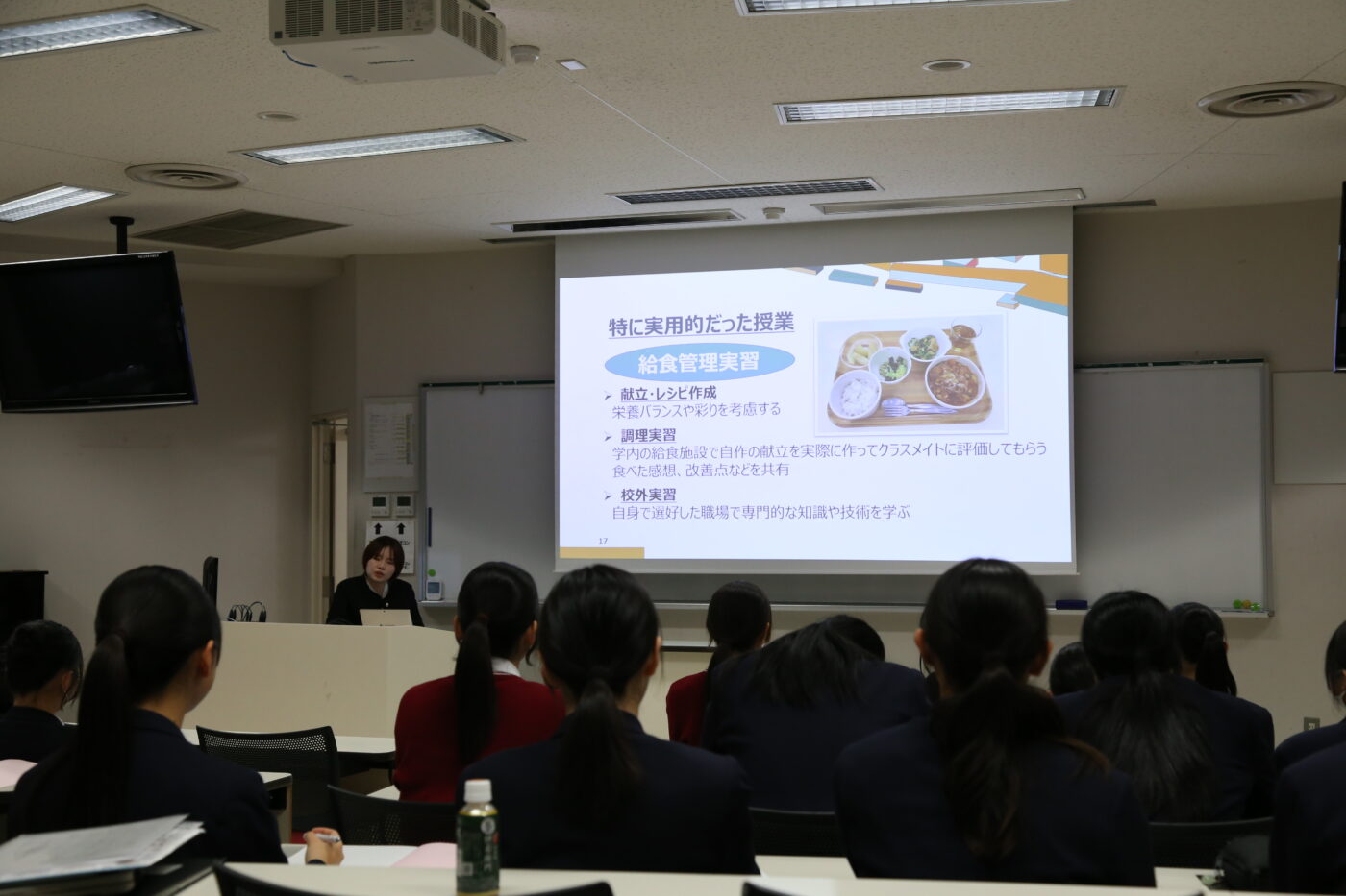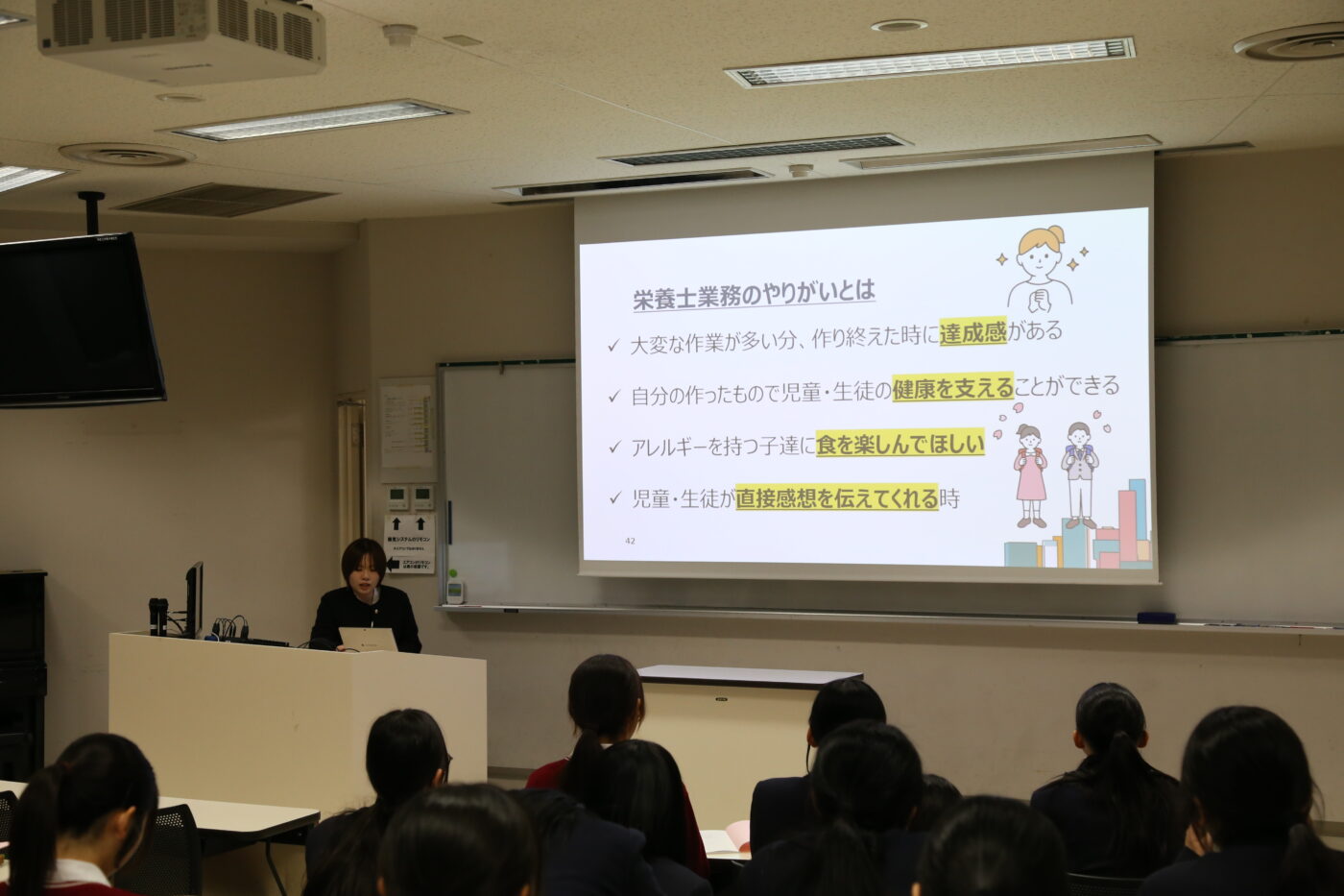 TOP > 今日の済美 > 食物科学コース > 【食物科学コ-ス1・2年】「栄養士の仕事の魅力]11月21日 お知らせ今日の済美 2025.11.26 【食物科学コ-ス1・2年】「栄養士の仕事の魅力]11月21日 食物科学コース 学校給食の現場で活躍されている本校食物科学コースの卒業生、東方さんをお招きし、「栄養士の仕事の魅力」という内容で講義をしていただきました。東方さんからは、高校時代に取り組んだことや進路選択のこと、現在の学校給食現場での奮闘ぶりを写真や動画を交えながらお話ししていただきました。講義の結びとして、食物科学コースの後輩である生徒たちに、「悩むことはいいこと。でも、深く悩みすぎず、楽しいことに挑戦して充実した高校生活を送ってほしい」とメッセージが送られました。 今日の済美一覧 新着記事 2025.11.26 【食物科学コ-ス1・2年】「栄養士の仕事の魅力]11月21日 食物科学コース 2025.11.25 【写真部】11/23 毛利家吊るし柿撮影 写真部の作品 2025.11.19 【美術科】第39回愛媛県高等学校総合文化祭 美術・工芸部門結果報告11月15日 大会実績 2025.11.18 【写真部】11/15 愛媛県高文祭写真部門講演会・表彰式 写真部の作品 FIND!キーワードやタグで検索! 合唱部 テニス部 弓道部 模擬国連 野球部 PTA 校外スポーツ活動 食物科学コース 美術科 写真部の作品 オープンスクール 大会実績 コンテスト キャリア教育講座 学校行事 卒業生の活躍 アート&デザイン作品