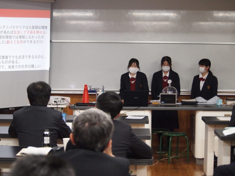 12月22日(月)、松山北高校で開催された愛媛県高等学校教育研究大会・理科部会で、自然科学部・宇宙班Bの生徒たちが高校の理科の先生方に向けて研究発表を行いました。これは、11月に開催された愛媛県高等学校総合文化祭・自然科学部門で愛媛県代表になり、全国高等学校総合文化祭に出場することになった「火星環境で地球の微生物による有機物の合成は可能か?」という研究です。発表した生徒は2年の土岐璃幸、村田奈々美、1年の松村千尋の3人でした。
