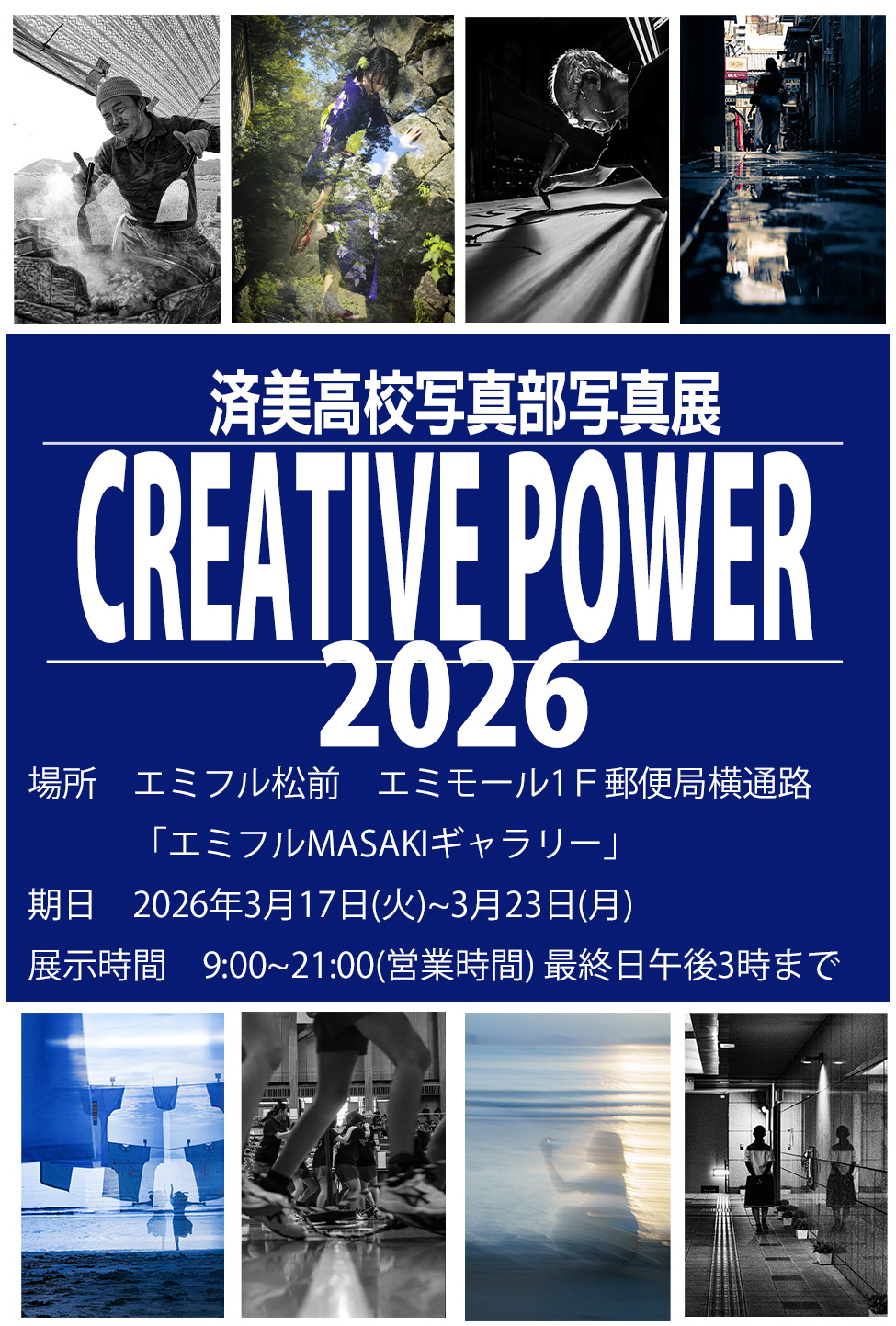TOP > 今日の済美 > 写真部の作品 > 【写真部】3/17~3/23 エミフルMASAKI単独写真展 お知らせ今日の済美 2026.03.05 【写真部】3/17~3/23 エミフルMASAKI単独写真展 写真部の作品 済美高校写真部写真展のご案内 済美高校写真部がエミフルMASAKIにて単独写真展を行います。 今までのコンテストの入賞作品を中心に、日ごろ県下さまざまな場所に出かけて撮影した作品や、高校生の感性で撮影したストリートフォトやポートレイトなど40点近くを展示します。土日を使って撮影した作品の数々をぜひご覧ください。 場所 エミフルMASAKI エミモール1階郵便局横通路 期日 3月17日(火)~3月23日(月) 展示時間 午前9時から午後9時まで 最終日は午後3時まで 今日の済美一覧 新着記事 2026.03.05 【防災】防災協力事業所の表示証交付式 2026.03.05 【写真部】3/17~3/23 エミフルMASAKI単独写真展 写真部の作品 2026.02.16 【合唱部】2/15 全国植樹祭イベント 合唱部 2026.02.12 【スポ科修学旅行】2日目 志賀高原 スキー! 学校行事 FIND!キーワードやタグで検索! 美術科 感謝メール 剣道部 テニス部 弓道部 模擬国連 野球部 PTA 校外スポーツ活動 食物科学コース 合唱部 写真部の作品 オープンスクール 大会実績 コンテスト キャリア教育講座 学校行事 卒業生の活躍 学習合宿 アート&デザイン作品