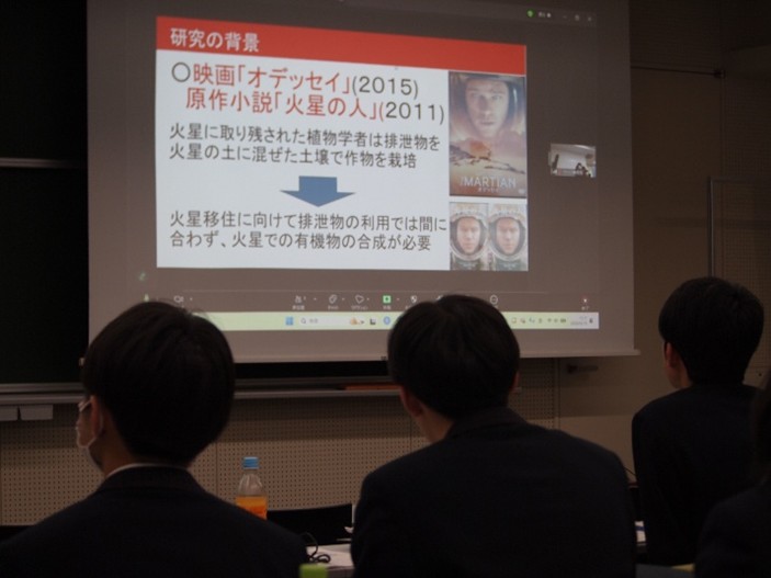 2日目は津京大学本郷キャンパス工学部で成果発表会が開催され、2年の土岐璃幸、村田奈々美、1年の松村千尋が発表しました。発表テーマは本校の文化・芸術発表会で3月12日にステージ発表した「火星テラフォーミング」の研究です。発表時間15分+質疑応答10分で、応答だけでなく他校への質問内容も採点されるので、とても大変でした。審査結果発表で優秀賞に選ばれた時にはとても驚きました。審査で待機中は大学院生の案内で本郷キャンパスツアーが行われました。表彰式の後、ジュンク堂池袋本店に立ち寄り、今後の研究に必要な参考文献の購入をしました。自由時間はありませんでしたが、とても充実した2日間でした。