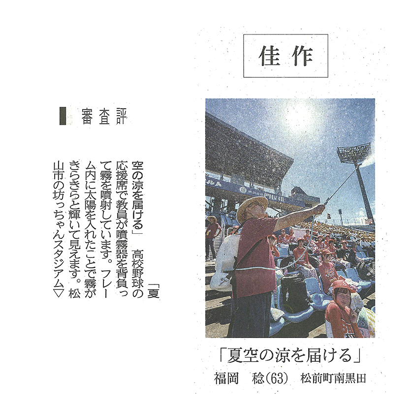 TOP > 新聞報道より > ニュース > 読者の写真[佳作]「夏空の涼を届ける お知らせ新聞報道より 2025.09.18 読者の写真[佳作]「夏空の涼を届ける 愛媛新聞の「読者の写真」で本校教員の福岡 稔先生の作品「夏空の涼を届ける」が佳作に選ばれました。 2025年9月18日(木) | 愛媛新聞掲載(掲載許可番号:d20250918-05) 新聞報道一覧 新着記事 スポーツ 2025.10.05 滋賀国スポ2025第7日【陸上】 少年男子A300 井手(済美高2年)懸命8位 スポーツ 2025.10.05 滋賀国スポ2025第7日【陸上】 少年男子共通棒高跳び 藤岡(済美高2年)5位笑顔 スポーツ 2025.10.05 滋賀国スポ2025第7日【陸上】 少年男子B走り幅跳び 古野(済美高1年)成長の3位 スポーツ 2025.10.05 滋賀国スポ2025第7日【カヌー】 成年女子カナディアンシングル500 経験1年半大木(済美高出)9位 FIND!キーワードやタグで検索! 写真部の作品 弓道部 模擬国連 野球部 PTA 校外スポーツ活動 食物科学コース 美術科 合唱部 オープンスクール 大会実績 コンテスト キャリア教育講座 学校行事 卒業生の活躍 アート&デザイン作品