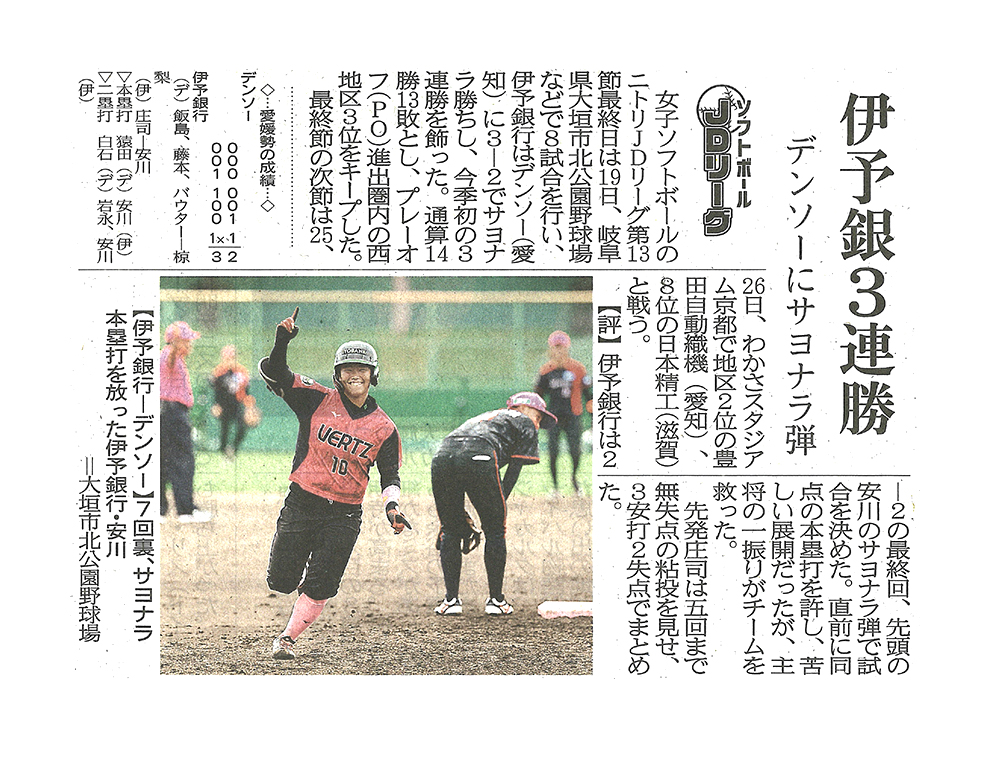 伊予銀3連勝 デンソーにサヨナラ弾 女子ソフトボールJDリーグ