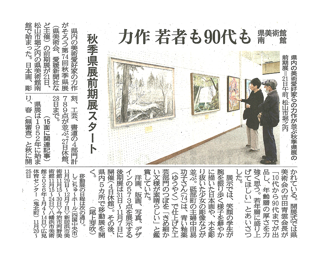 TOP > 新聞報道より > ニュース > 秋季県展前期展スタート 県美術館南館 お知らせ新聞報道より 2025.10.22 秋季県展前期展スタート 県美術館南館 県内の美術愛好家の力作がそろう第74回秋季県展の前期展が松山市堀之内の県美術館南館で始まりました。 2025年10月22日(水) | 愛媛新聞掲載(掲載許可番号:d20251022-02) 新聞報道一覧 新着記事 先輩の活躍 2025.10.22 ドラフト 愛媛の注目選手(下) 愛媛MP三上ら複数候補 スポーツ 2025.10.22 全国高校バスケ県予選組み合わせ 16強25日激突 ニュース 2025.10.22 日本画の魅力 高校生に伝授 松山での「院展」前に特別授業 ニュース 2025.10.22 秋の県展 前期◆作品紹介[日本画] FIND!キーワードやタグで検索! 写真部の作品 弓道部 模擬国連 野球部 PTA 校外スポーツ活動 食物科学コース 美術科 合唱部 オープンスクール 大会実績 コンテスト キャリア教育講座 学校行事 卒業生の活躍 アート&デザイン作品