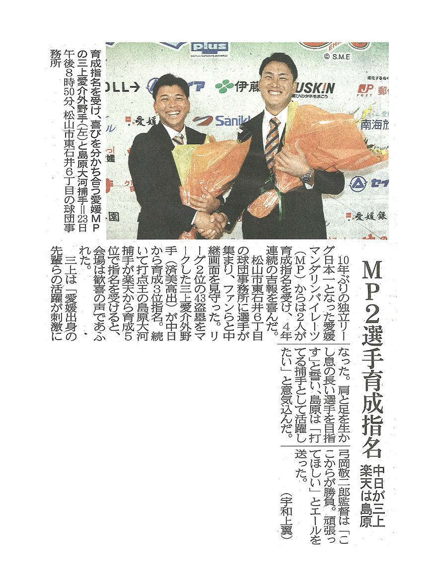 プロ野球のドラフト会議が23日開かれ、独立リーグ日本一になったマンダリンパイレーツから三上愛介選手(済美出身)が中日から育成3位指名を受けました。三上選手のコメントが掲載されています。