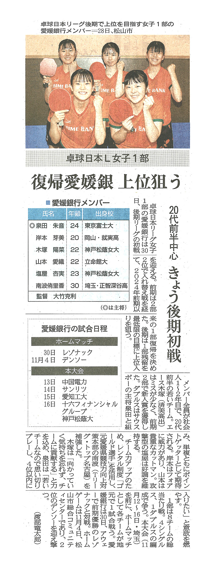卓球日本リーグ女子1部も愛媛銀行は30日、後期リーグの初戦を迎えます。