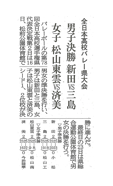済美女子は今治精華と対戦。2-0で勝利し決勝へ進出しました。決勝は23日県総合運動公園体育館で行われます。