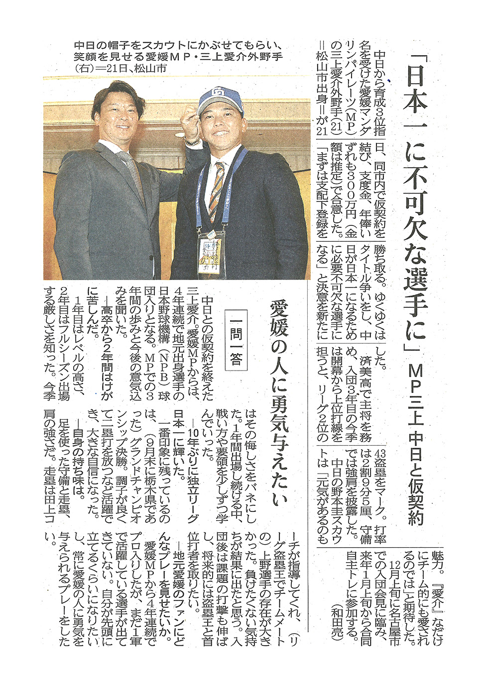 愛媛MP・三上が中日と仮契約 「日本一へ不可欠な選手に」