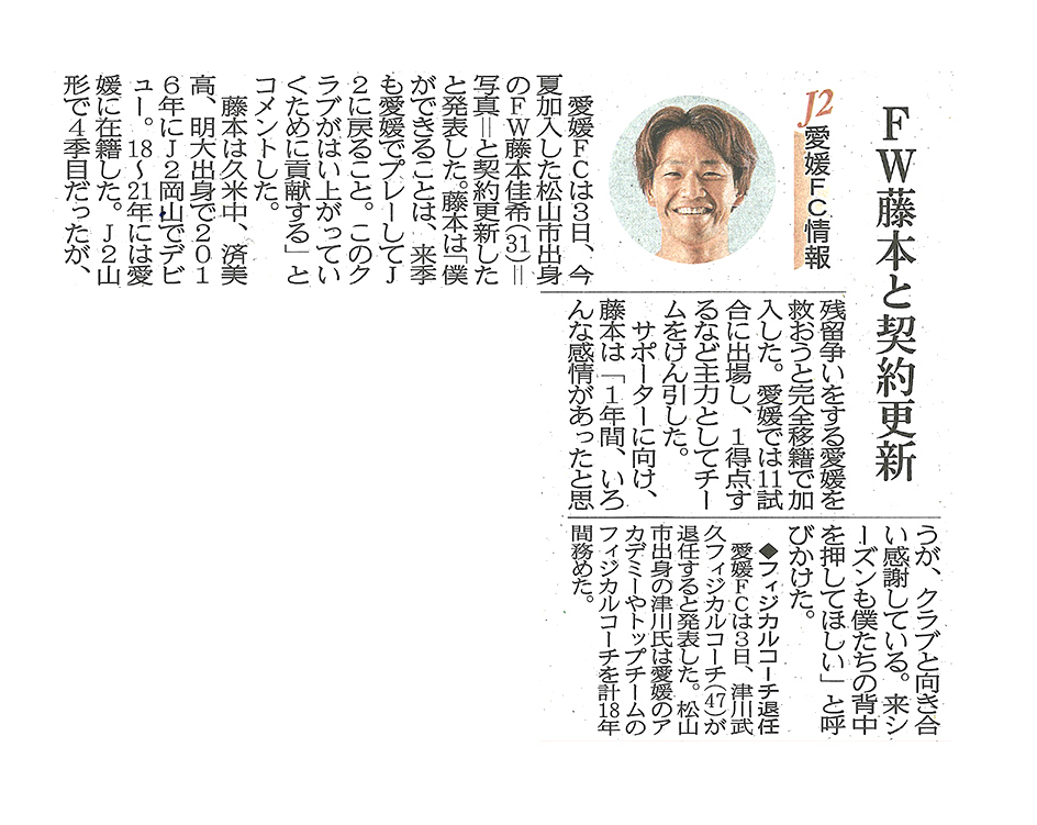 [愛媛FC情報]FW藤本(済美高出身)と契約更新