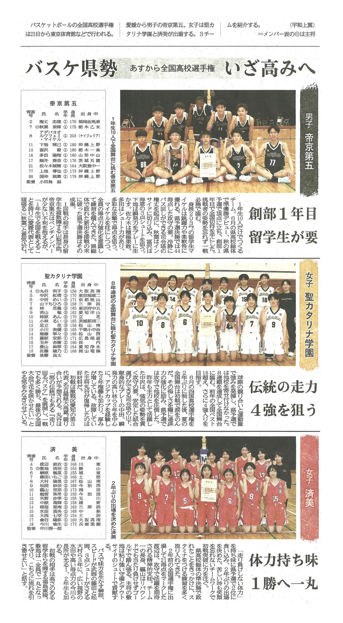 バスケットボール全国高校選手権に出場する女子バスケットボール部が愛媛新聞で紹介されました。