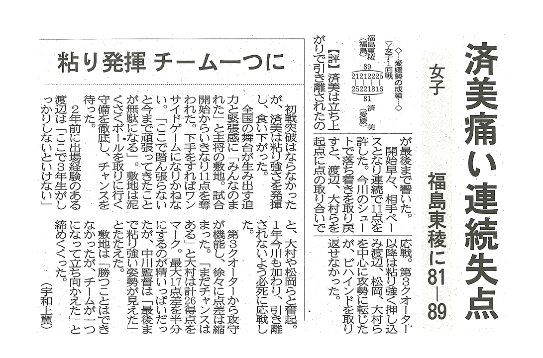 出場した済美女子は福島東陵と対戦しましたが81-89で敗退しました。