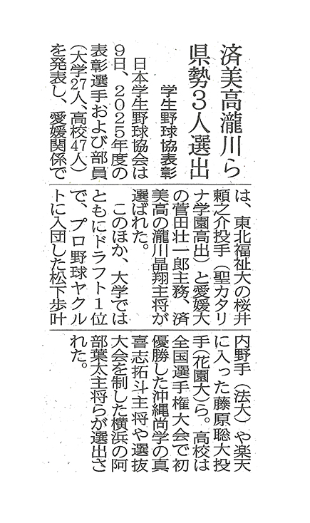 愛媛関係では済美高の滝川晶翔主将を含む3名が選ばれました。