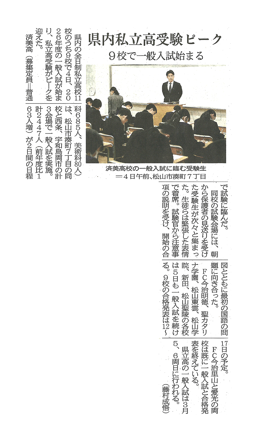 愛媛県内の私立高で受験ピーク 9校で一般入試始まる