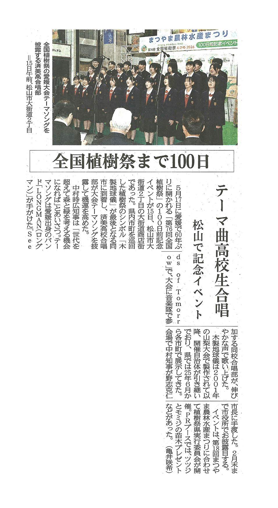 済美高合唱部がテーマ曲披露 5月開催「全国植樹祭」の100日前イベント松山