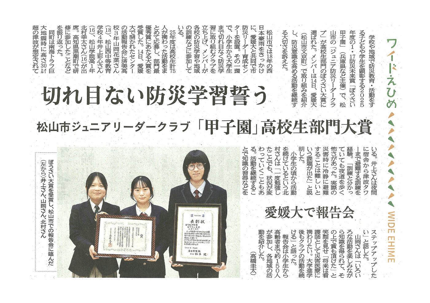 松山のジュニア防災リーダークラブが大賞 「ぼうさい甲子園」高校生部門